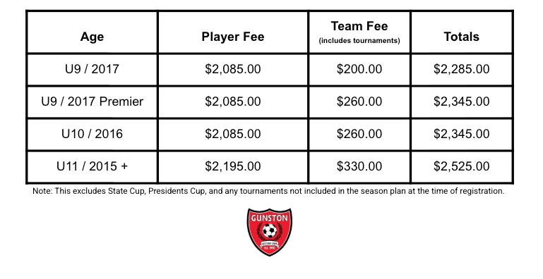 - Gunston Soccer Club Team Fees (Tournament Participation): Additional team-specific programming including tournament competitions (2 fall and 2 spring)